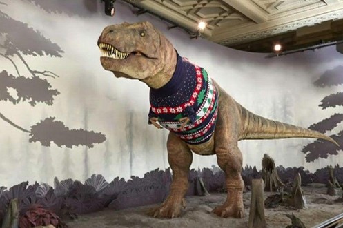 Au musée de Londres, le T-Rex a mis son plus beau pull de Noël