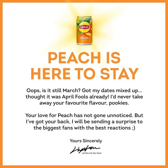 Il faut dire que Lipton a su appuyer là où ça fait mal. Comme si la perte n’était pas suffisante, la marque a glissé une phrase lourde de sous-entendus: «Maybe one day peach will make a legendary comeback» (En français: «peut-être qu'un jour la pêche fera un retour légendaire»).