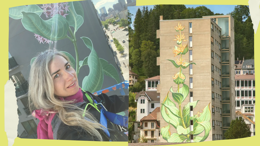 Elle a également pu réaliser quelques œuvres au Tessin - à Chiasso, Mendrisio ou Bellinzone. En Suisse romande, c'est au Locle qu'elle a décoré en 2021 un immeuble de 30 mètres de haut avec une gigantesque gentiane jaune.