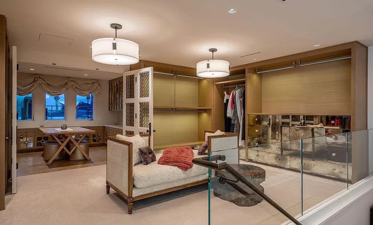 «Profitez du plus haut degré de sophistication avec cet extraordinaire dressing sur deux étages, où l'opulence et la fonctionnalité s'harmonisent et créent une oasis pour l'élite consciente de la mode. Cet espace soigneusement conçu s'étend sur deux étages et offre le refuge ultime pour organiser et présenter votre garde-robe au style incomparable.»