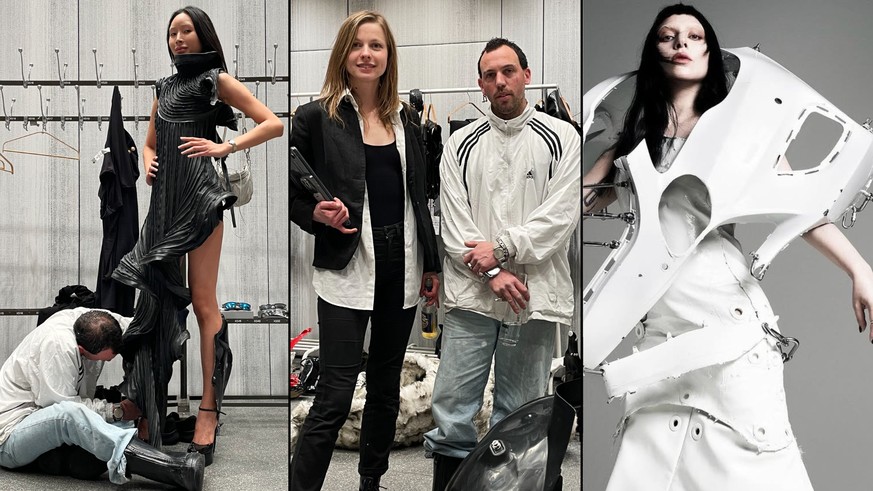 Les tenues, caractérisées de «brutalistes», sont réalisées à partir de pièces automobiles et de déchets industriels. Des chambres à air pour vélos, par exemple. Ce jour-là, à Zurich, le challenge pour les modèles est de réussir à marcher avec d'immenses chaussures à plateforme. Le défi est de taille! Ils ont à peine quelques minutes pour s'exercer avant le défilé du soir.