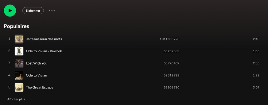 Sur Spotify, elle va jusqu'à comptabiliser plus d'un milliard d'écoutes, devenant la chanson francophone la plus écoutée. Patrick Watson se permet de devancer d'autres artistes francophones, comme le Belge Stromae ou Aya Nakamura, des poids lourds de la scène musicale mondiale.