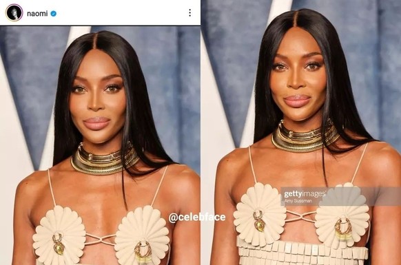 Le compte Instagram CelebFace, célèbre pour épingler les stars qui abusent des apps de retouches photo, a publié deux clichés côte à côte de Naomi Campbell: celui qu'elle a partagé sur Instagram et une photo Getty, agence officielle. Ainsi, on voit que le mannequin a éclairci son teint, a lissé sa peau, a affiné son nez et a exagéré sa «Jaw Line».