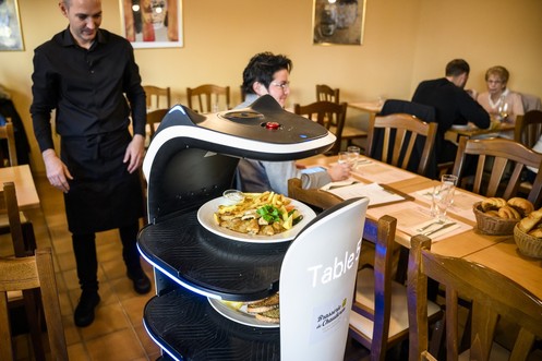 Un robot se faufile entre les tables d'un resto