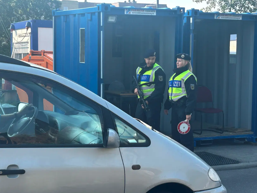 Deux gardes-frontière allemands se tiennent devant un conteneur bleu. Il a une mitraillette en bandoulière, elle porte une louche de police rouge à la main. La plupart des conducteurs peuvent passer la frontière sans être inquiétés.