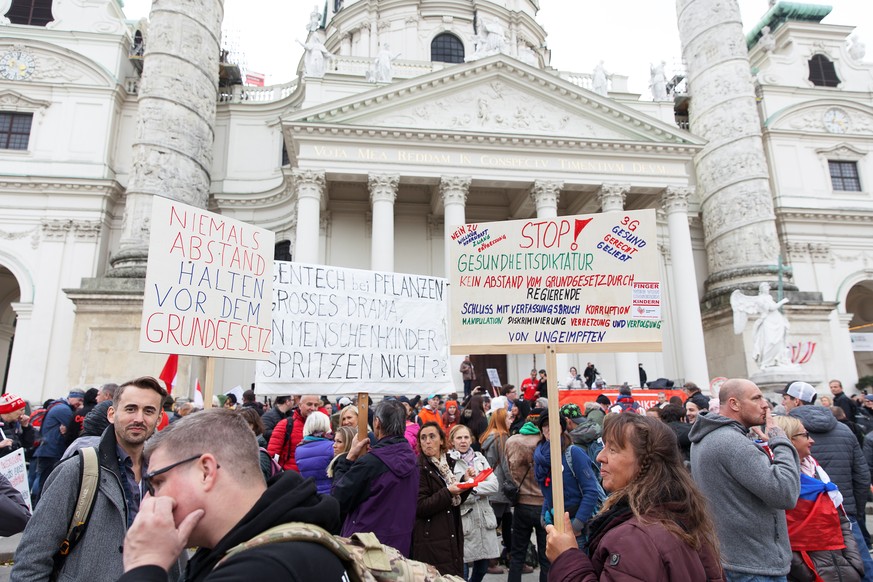 Des centaines de manifestants se sont réunis dimanche après-midi devant la chancellerie, brandissant des pancartes disant «non à la vaccination obligatoire».