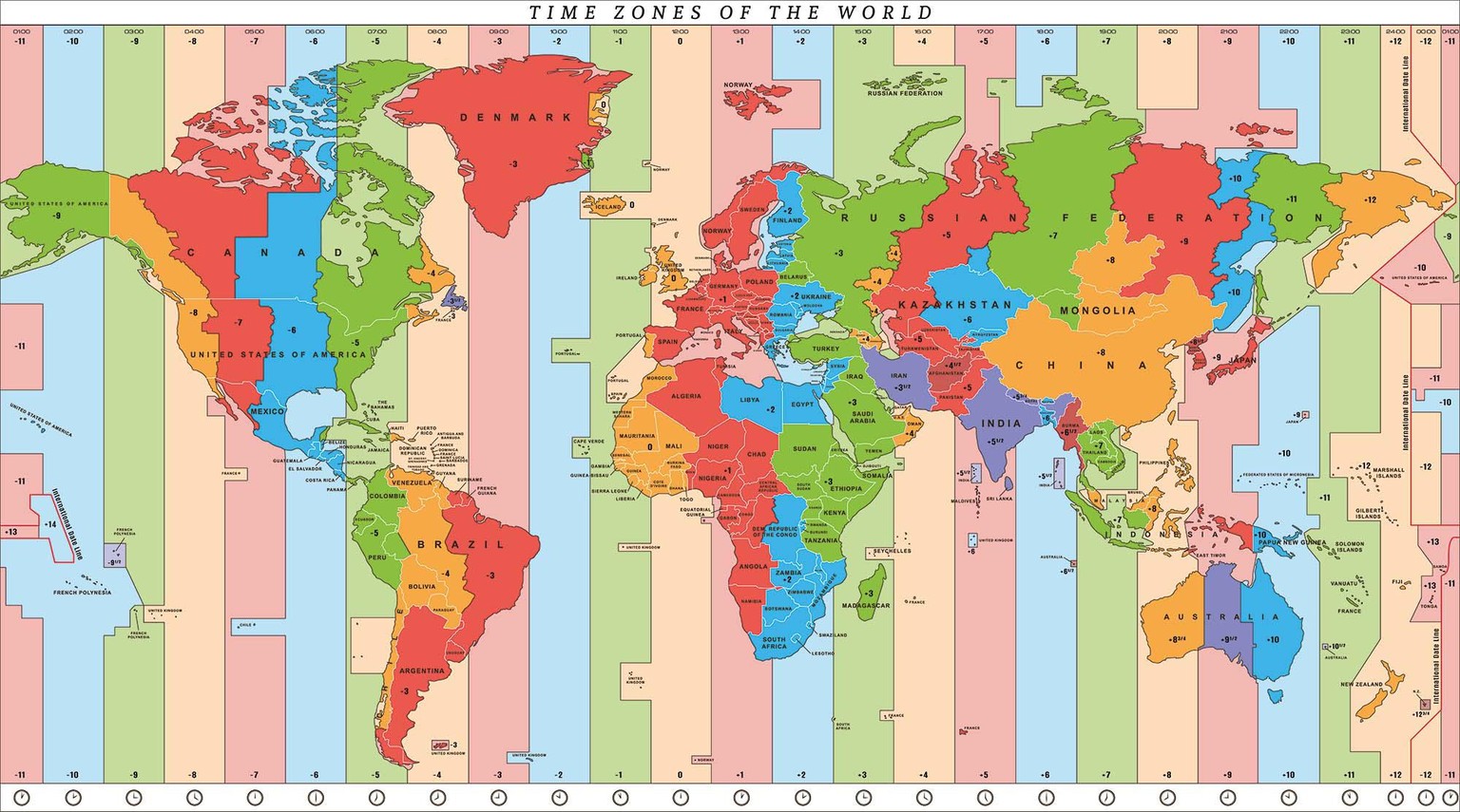 Ainsi, s'il est samedi 11h30 (UTC+1) chez nous en Suisse, les horloges sur les Christmas Islands des Kiribati indiquent déjà dimanche 00h30 (UTC+14) et aux Samoa américaines, il est encore vendredi 23h30 (UTC-11).