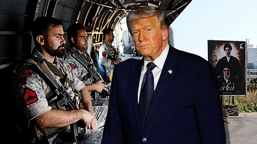 Des soldats iraniens et des affiches du guide suprême iranien tué et de son fils Mojtaba Khamenei. Trump n'as pas gagné la guerre.Image: montage watson