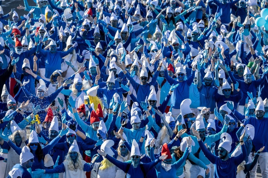 Des milliers de Schtroumpfs, Schtroumpfettes ou grands Schtroumpfs se sont déhanchés au son d'un DJ, en attendant le comptage du rassemblement.