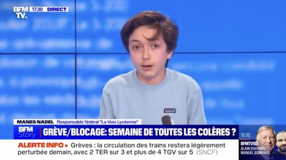 C'est sûr, il la ramène. Mais Manès Nadel, quinze petites années au compteur, une tronche d'enfant de choeur et une verve de syndicaliste qui pourrait faire passer Philippe Martinez pour un jeune trader de La Défense, sait parfaitement de quoi il cause. C'est même précisément ce qui peut susciter un petit malaise chez le téléspectateur. Comme si Mélenchon s'était réincarné dans le corps d'un mioche du 15e arrondissement.