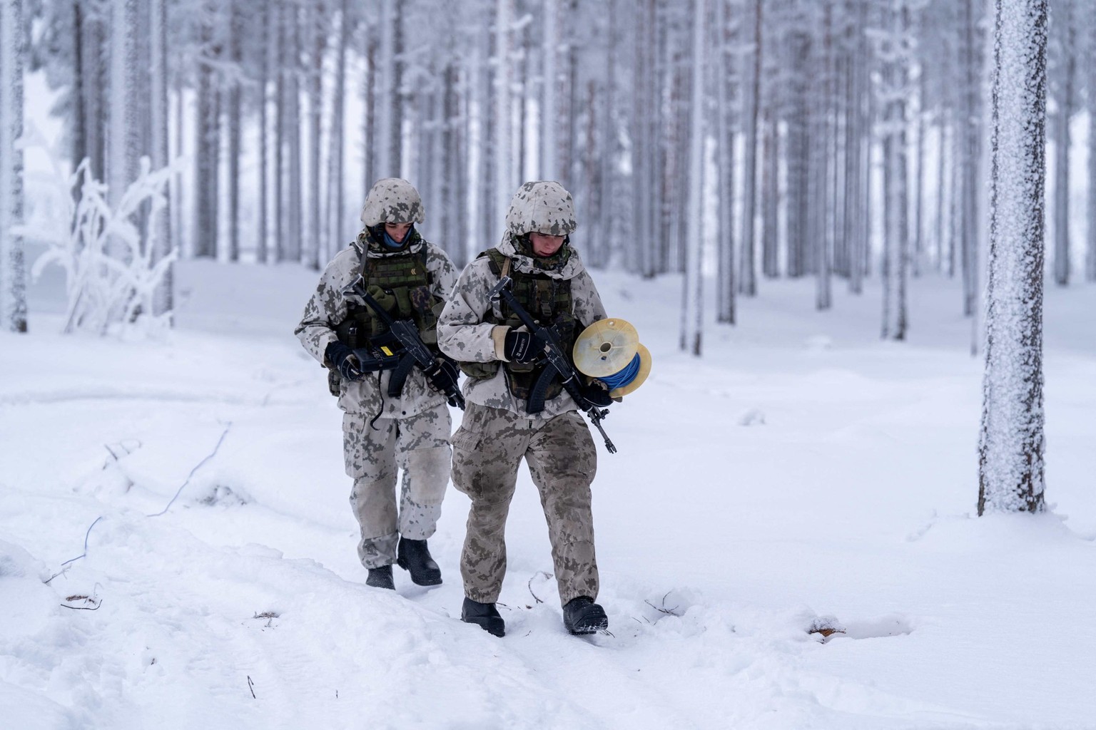 Agenouillé dans la neige, le jeune conscrit tire entre deux arbres le fil qui, s'il est rompu, déclenchera la charge explosive dissimulée vingt mètres plus loin: à peine sortie du traité les interdisant, l'armée finlandaise s'entraîne à poser des mines antipersonnel, invoquant la menace sécuritaire russe.