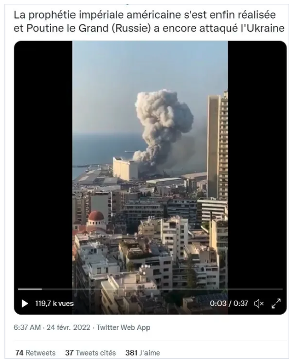 Cette vidéo amateur d'une explosion est censée montrer une attaque russe contre l’Ukraine. Il s'agit en fait des explosions au cœur de Beyrouth (Liban) en août 2020.