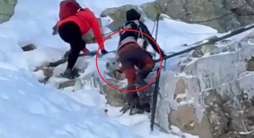 Une vidéo publiée sur Facebook montre la mère et le père, leur bébé attaché sur la poitrine, peinant à gravir un escalier de glace le long d’une paroi rocheuse.