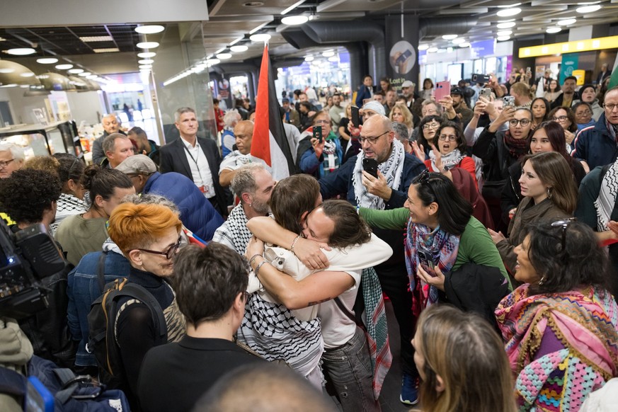 Une centaine de personnes munies de drapeaux palestiniens attend impatiemment les neuf Suisses qui reviennent de détention en Israël. Lorsque les membres de la flottille apparaissent, l'émotion envahit les personnes présentes, aux cris de joie et aux larmes de certains se mêlent les slogans «Free Palestine» scandés à gorge déployée.