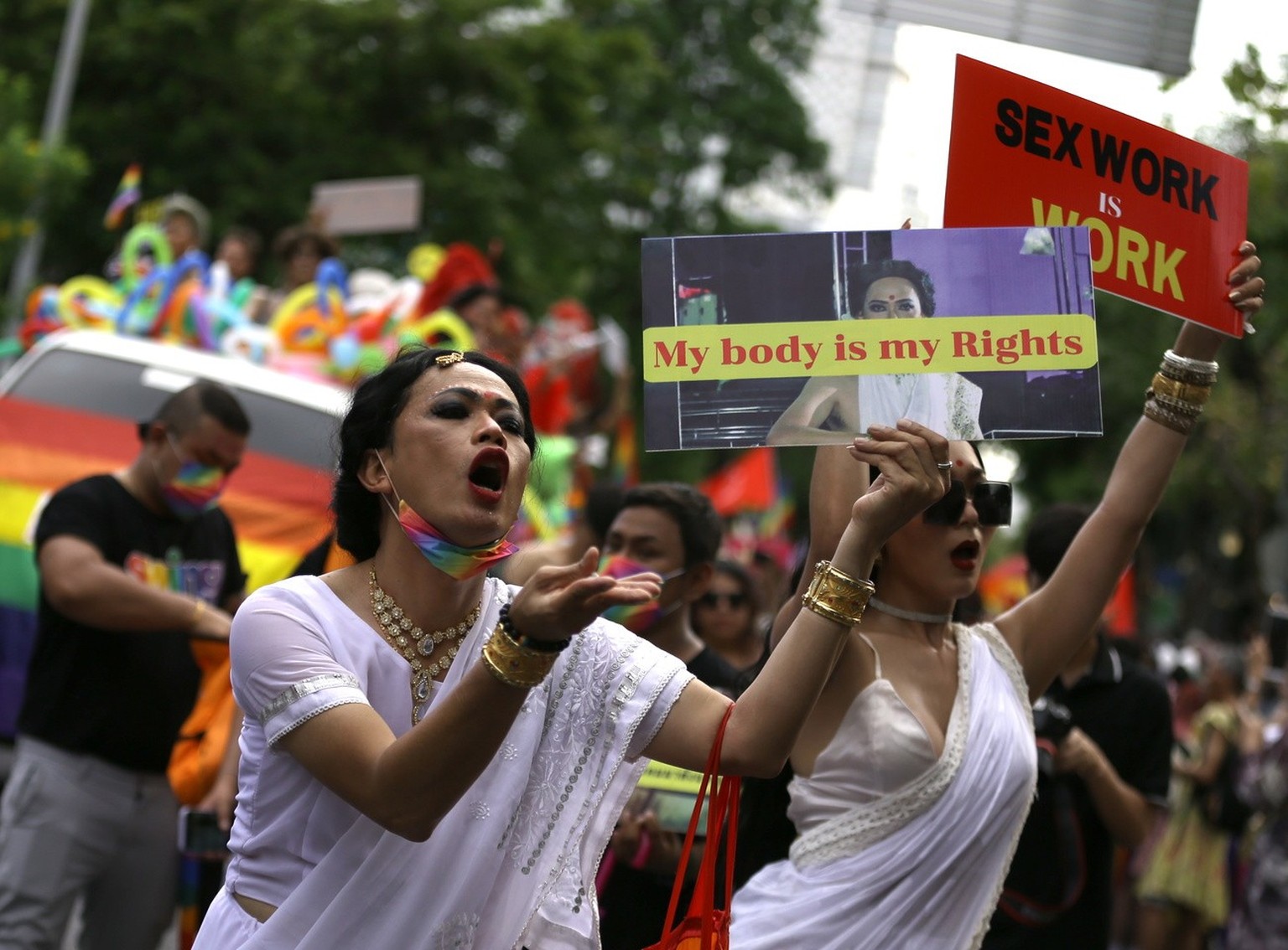 Anticha Sangchai et Vorawan Ramwan, vêtues de robes de mariées diaphanes qui ont attiré l'attention de la foule et des réseaux sociaux, ont célébré leur union au milieu du défilé. «Mes très chers amis défilent ensemble et nous ont fait vivre un moment très spécial», a confié Anticha à l'AFP, qualifiant l'expérience d'«honneur» et réclamant «le droit d'avoir une famille, d'aimer et de se marier avec qui on veut».