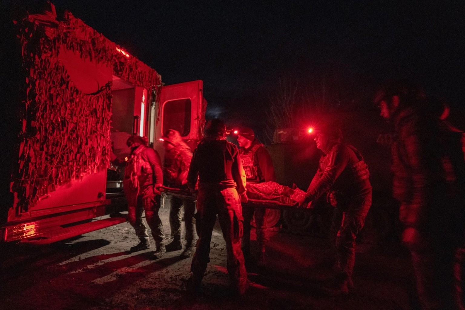 Dans l’obscurité, je n’entends que le bruissement de la couverture de survie et un faible gémissement. Un homme est recroquevillé sous la couverture. «On dirait une crevette », dit Sofija. Je me dis qu'elle est d'un calme déroutant. Faut-il devenir ainsi pour pouvoir supporter la souffrance permanente et encaisser de telles images? Est-ce que cela m’arrivera aussi un jour, tout naturellement? Le soldat est installé dans notre ambulance. Sa cheville est tordue, des éclats d’obus sortent de sa jambe.