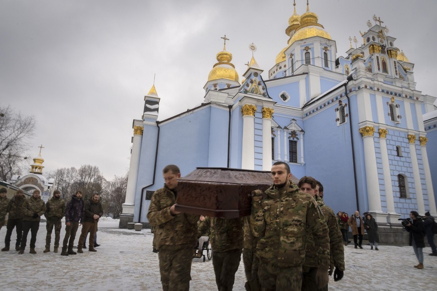 Les volontaires d'une organisation paramédicale portent le cercueil de l'ambulancier Nikola Mirovic, tué sur la ligne de front lors de l'évacuation d'un soldat blessé dans la région de Donetsk, le 13 décembre 2022.Image: Keystone