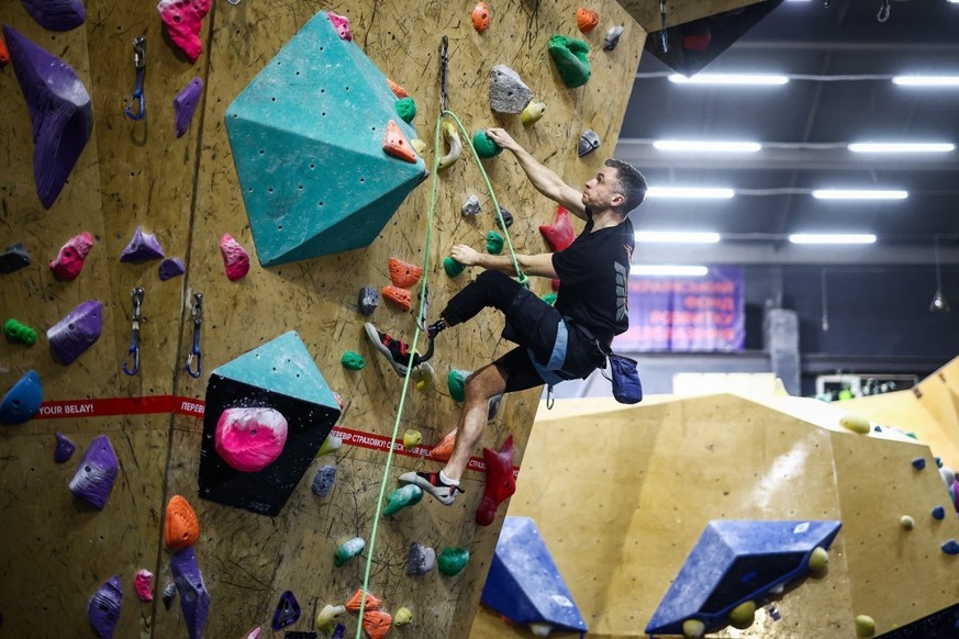 Chacun ajuste son harnais avant de se lancer sur les voies, une prise de couleur après l'autre, jusqu'au sommet. Oleg Khmylevskiï, un ex-combattant tout en muscles de 38 ans qui a perdu sa jambe droite au front, témoigne:
