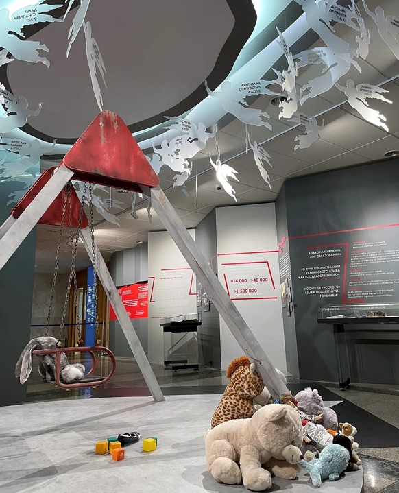 Un livre pour enfants est ouvert dans l'une des vitrines de l'exposition. Nous pouvons y lire «nous sommes Ukrainiens» en ukrainien et dans une écriture enfantine gribouillée. Des casquettes militaires de la Garde nationale ukrainienne sont posées à côté, avec des biscuits de l'armée et un paquet vert sur lequel est écrit «cartouches Otan». Au centre, nous observons une vieille balançoire rouillée, des animaux en peluche neufs éparpillés autour ou encore un soulier verni pour enfant. Au-dessus de celle-ci, des anges en plastique blanc flottent. Nous pouvons y lire les informations suivantes: Daria, 3 ans, Artjom, 7 ans, Sergej, 6 ans. Ces prénoms sont censés rendre hommage aux enfants tués dans le Donbass, mais aucune autre explication n'est donnée.