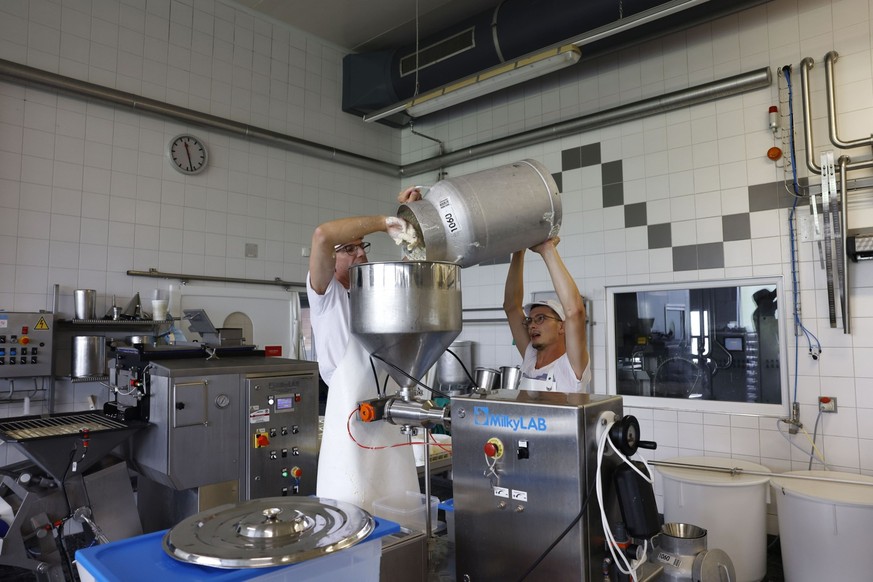 Une pâte de fromage chaude et épaisse jaillit d'une machine et tombe dans les creux ronds d'un tambour en rotation, formant des boules de la taille d'un poing. Cela pourrait s'arrêter là. Mais lorsque la mozzarella (en savoir plus sur la mozzarella suisse) est prête, c'est là que les choses sérieuses commencent! Lukas Bucheli saisit une boule: elle est à 70°C et encore toute molle. En quelques gestes, il l'aplatit et forme les bords. Il passe brièvement ce "sac de pâte" sous la machine de dosage, d'où s'écoule un mélange de double crème et de filaments de mozzarella. Ensuite, il noue le petit sac et le refroidit dans l'eau glacée. La burrata est prête!