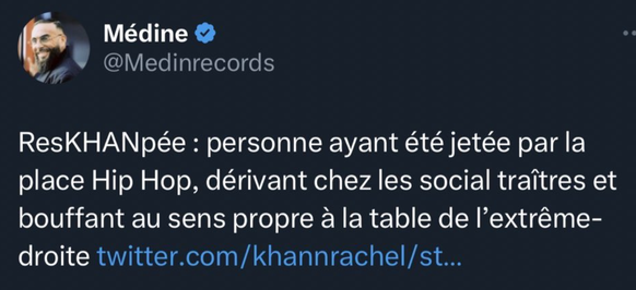Sauf qu’un récent jeu de mot de son cru peut faire douter de la sincérité de son inflexion, du moins en cette occasion: «ResKHANpée», comme «rescapée ». Formulé par le rappeur dans un tweet daté du 10 août, effacé depuis, il visait la militante laïque Rachel Khan, une ex-athlète de père gambien et de mère française d’origine juive ashkénaze, dont la famille a péri dans les camps nazis à l’exception du grand-père. Rachel Khan avait précédemment qualifié Médine de «déchet». Celui-ci répliquait par ce jeu de mot faisant selon lui référence au départ de Rachel Khan d’un centre culturel hip-hop qui ne souhaitait plus sa présence.