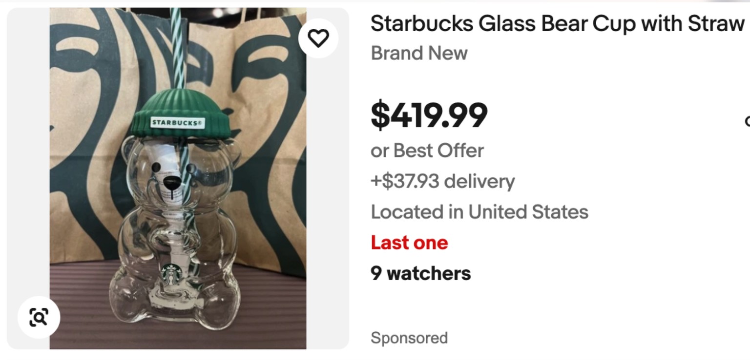 L’engouement autour du petit ours en verre était pourtant déjà palpable avant même sa sortie. Une vidéo annonçant le Bearista sur TikTok a été visionnée plus de 33 millions de fois. Aujourd’hui, la tasse en forme d’ours est en rupture de stock. Mais, comme tous les moyens sont bons pour se faire de l’argent, on la retrouve désormais en grand nombre sur des plateformes de revente en ligne comme eBay, souvent à des prix exorbitants. Chez Starbucks, elle coûtait 43,95 $ (environ 35 CHF); à la revente, certains exemplaires s’affichent désormais à plusieurs centaines de dollars.