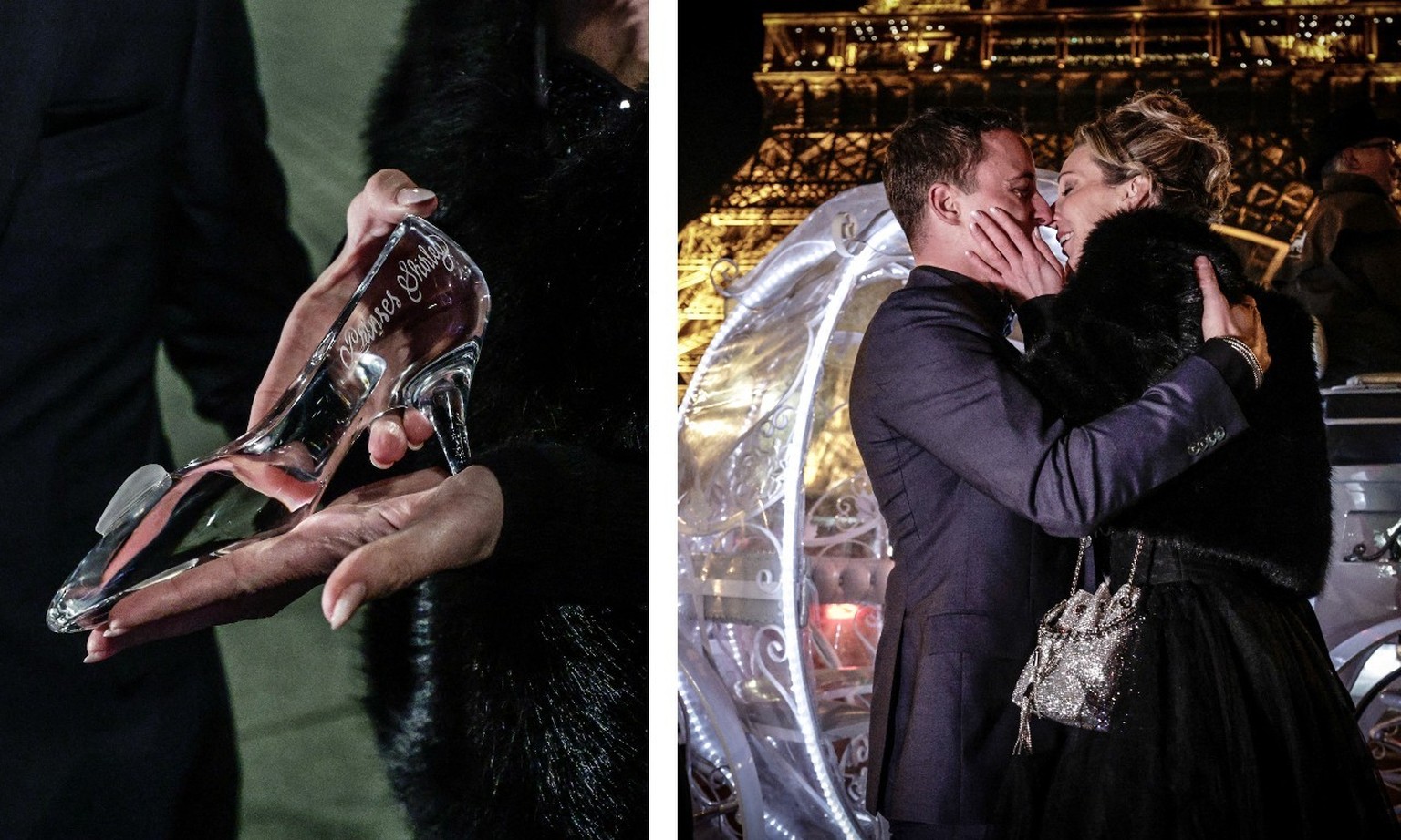 Philippe Delon, cocher et propriétaire du carrosse, ouvre devant un couple un écrin rose dévoilant un escarpin de verre:«Je viens chercher une princesse!» Le couple monte à bord et traverse les beaux quartiers jusqu’à la Tour Eiffel. Sous les notes d’un violoniste, l’homme pose un genou à terre et demande la main de sa compagne.