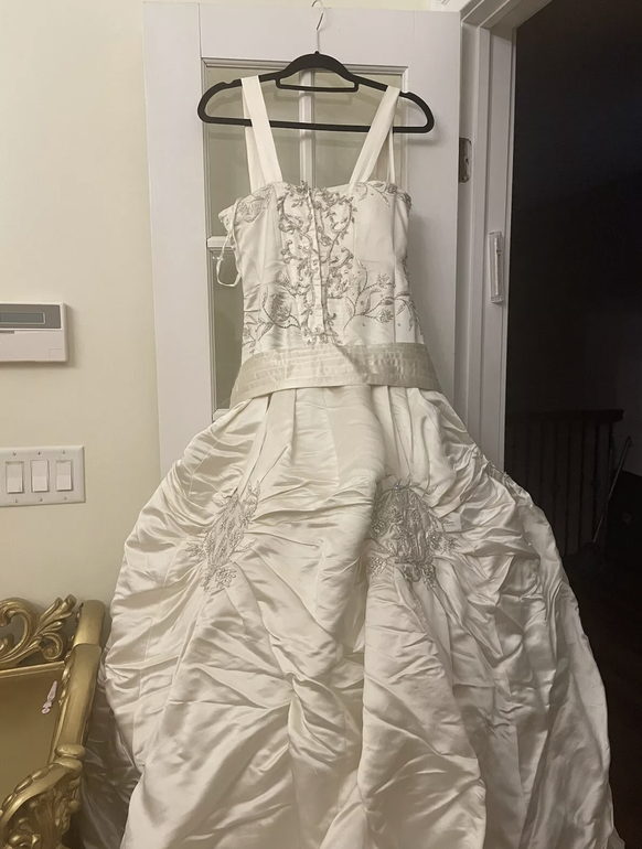 Citons notamment l'ajout d’une nouvelle épaisseur de satin pour faire passer la robe de la taille 0-2 (l'équivalent d'un 32-34 en Suisse) à la taille 4-6 (36-38), ainsi que de broderies et de bretelles. Toutefois, si vous êtes dotée d’un petit gabarit, rassurez-vous: la vendeuse assure que le tissu peut être retiré pour ramener la robe à sa taille initiale.