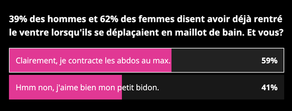 Alors, petit paradoxe , vous ne faites rien contre votre petit bidon, mais vous cachez votre ventre. En revanche, on salue l'honnêteté de 59% d'entre vous.