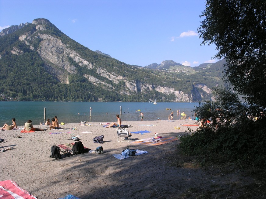 La plage de sable de Gäsi offre un panorama spectaculaire sur les montagnes. Un bistrot, une aire de jeux et un terrain de beach-volley complètent l'offre. Grâce à la forêt qui se trouve derrière, de nombreuses places ombragées permettent de se maintenir au frais.