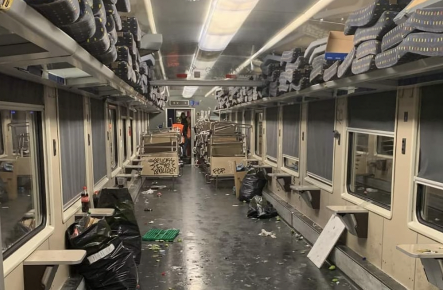 Dimanche après-midi, Marco Rüegger, responsable de la sécurité de l'exploitation aux CFF, a posté sur Twitter une photo montrant un wagon démoli. Selon lui, ce sont des supporters de football qui auraient causé les dommages.