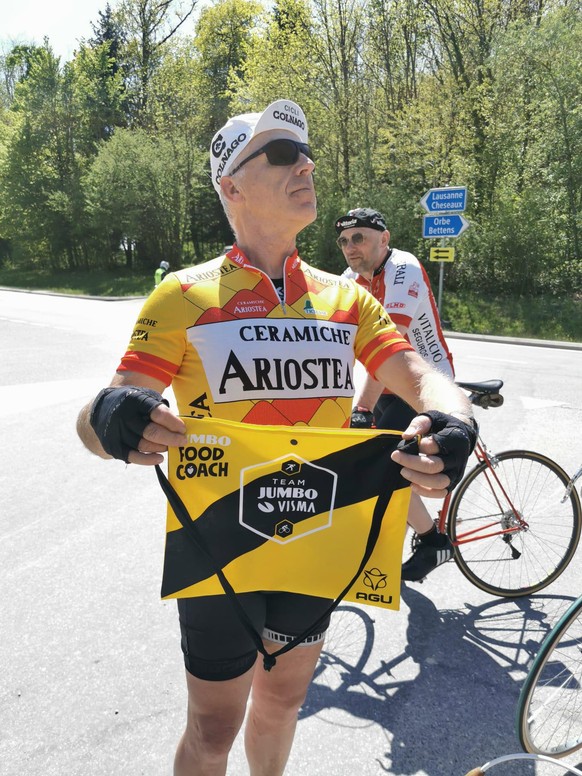 Les rires accompagnent les essayages de la bande. Au milieu de ses trésors du monde de la petite reine, qu'il collectionne depuis cinquante ans, Michel se fait taquiner par ses copains. L'aîné des «jeunes vieux», 65 ans, est un mordu de cyclisme depuis qu’il est gamin. Dans son musée du vélo, chez lui, à Cheseaux, il habille ses copains. «Avec de vrais maillots de l’âge d’or du cyclisme, les années 1970. J’ai même un maillot des années 1940, regarde!», s’exclame-t-il, souriant d’une oreille à l’autre, en me montrant un t-shirt Cilo de 1947. L'un des cyclistes me souffle qu'il surnomme son ami «Wiki Michel». Ah, très bien, moi qui n'y connais pas grand-chose en cyclisme, je ne m'inquiète pas: Wiki Michel pourra écrire cet article à ma place si je pédale dans la semoule.