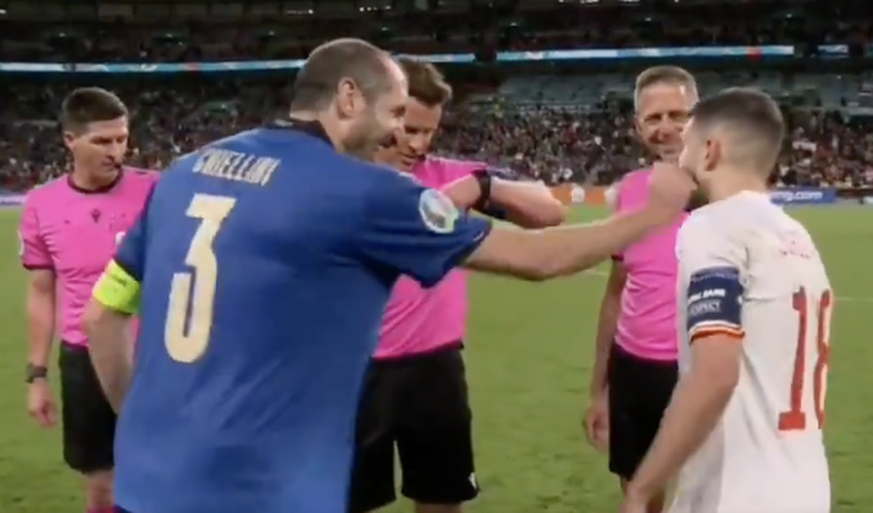 La scène a fait sensation, et il y a de quoi. Mardi soir, le capitaine de l'Italie Giorgio Chiellini a eu une attitude complètement folle avant la séance de tirs au but contre l'Espagne, en demi-finale de l'Euro. On le voit hilare, exubérant, poussant son homologue espagnol Jordi Alba et allant même jusqu'à lui pincer la joue et le soulever. Une attitude qui contraste totalement avec celle du capitaine ibérique, nettement plus conventionnelle dans pareille situation, si solennelle et stressante.