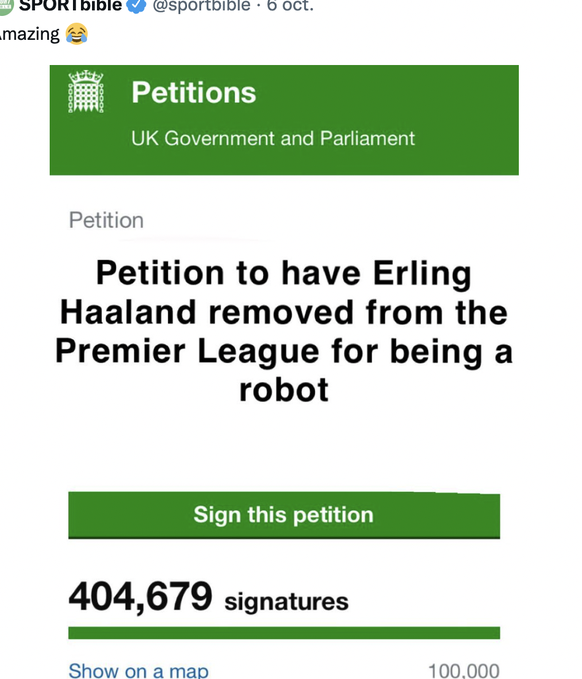 14 buts en 8 matchs, des triplés à la pelle, Erling Haaland affole tous les compteurs de Manchester City et survole la Premier League. En bref, il est fort, beaucoup trop fort. Et ça ne semble pas plaire à tout le monde. En effet, une pétition a été lancée auprès du parlement britannique pour l'exclure du championnat. «Il faut retirer Haaland de la Premier League, car c'est un robot», réclame la demande humoristique et non moins officielle qui a été soumise sur le site web du parlement britannique (retirée depuis).
