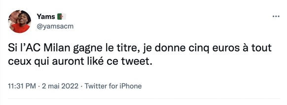 Yams a lui-même avoué sa surprise face à tant de likes: «J’ai tweeté ça en mode c’est impossible et je suis serein, sauf que y a des vrais rats dans ce monde.» Il paraît que certains ont créé plusieurs comptes afin de liker plusieurs fois le message et donc, de recevoir plusieurs fois les 5 euros promis par le Milanais.