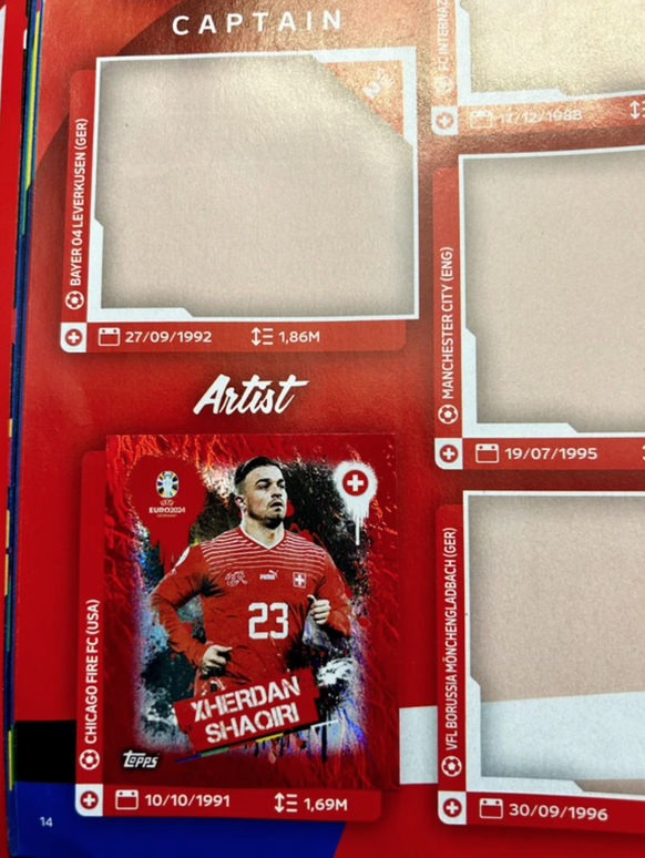 Il n'y a pas que 18 vignettes classiques par nation. Dans chaque équipe, le capitaine est mis en avant. Il y a aussi un «artist» qui se distingue visuellement par rapport aux autres. Pour la Suisse, Granit Xhaka est le capitaine, Xherdan Shaqiri notre artiste.
