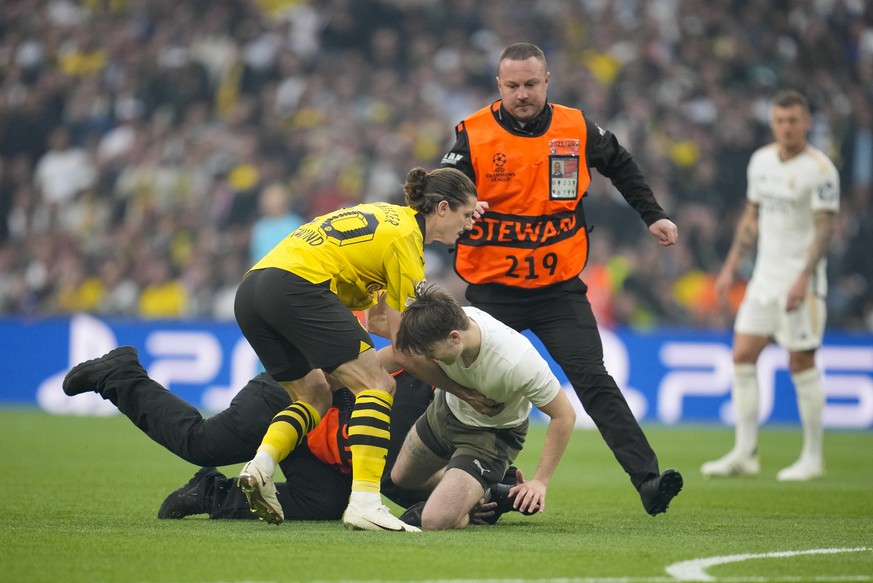 Etonnement, devant le manque de réaction des services de sécurité, le milieu du Borussia Dortmund, Marcel Sabitzer, a dû intervenir, aidant les stadiers à stopper l'un des hommes se pavanant dans le stade.