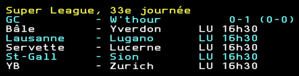 Il y a aussi une partie en cours en Challenge League. Thoune mène actuellement 1-0 face au FC Wil grâce à Montolio (3e). On vous donnera le score en fin de match mais pour l'instant, concentrons-nous sur la première division!