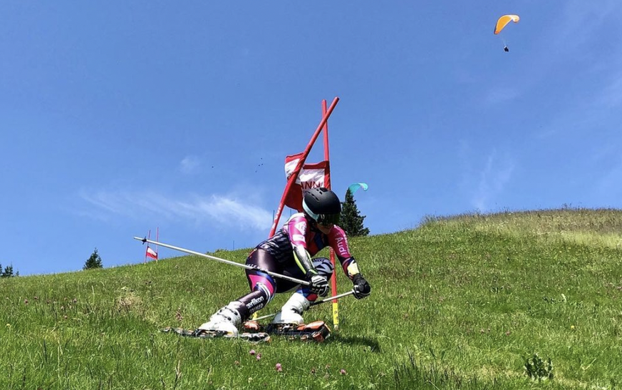 Sur le parcours construit par son frère à Villars-sur-Ollon, la championne du monde de skicross reproduit des conditions de course, à tout le moins des mouvements mécaniques. Même type de virages, même type de topographie, même recherche d'équilibre. Seule la vitesse change.