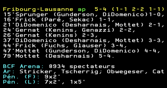 Contrairement au dernier duel, les Vaudois n'ont jamais baissé les bras, même en étant menés au score. Ils sont revenus deux fois à la marque, par Frick à la 16e pour le 1-1 et Gernat à la 24e pour le 2-2. Le défenseur slovaque a donné l'avantage aux siens deux minutes plus tard, suivant parfaitement un magnifique solo de Kenins dans la défense de Gottéron. La troupe de John Fust a aussi mené 4-3 grâce à un doublé de Frick (44e), mais Mottet égalisait d'un tir violent en power-play – comme les trois buts fribourgeois précédents – quelques secondes plus tard.