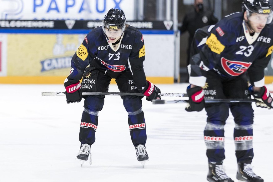 Les hockeyeurs fribourgeois, Sandro Schmid (à gauche) et Samuel Walser, résignés, après une défaite lors de la saison régulière. image: keystone