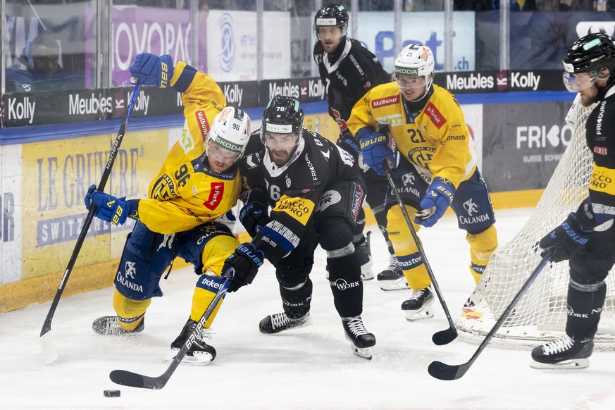 Chris Egli (HCD), Juuso Arola (HCFG), und Julian Parree (HCD), von links, kaempfen um den Puck zweiten Eishockey Playoff Finalspiel der National League zwischen HC Fribourg-Gotteron (HCFG) und HC Davo ...