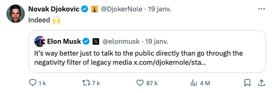Novak Djokovic n'est pas resté insensible à la validation de sa démarche par Elon Musk. Le Serbe a, à son tour, repartagé sur X le message du milliardaire basé aux Etats-Unis en ajoutant un «Indeed» («en effet», en français), avec l'emoji de deux mains en l'air.