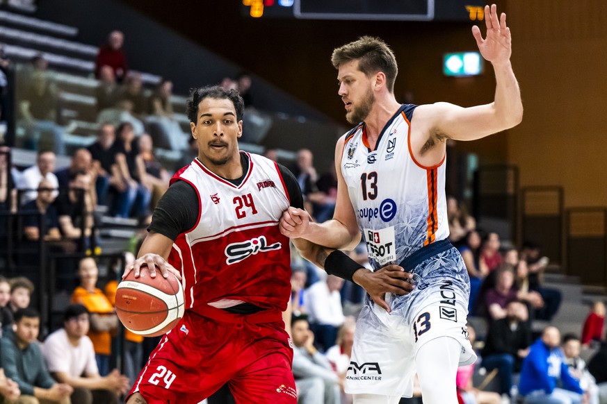 Justin Hill, ici au duel avec l'ex-joueur d'Union Yoan Granvorka, a marqué 21 points pour les Neuchâtelois.