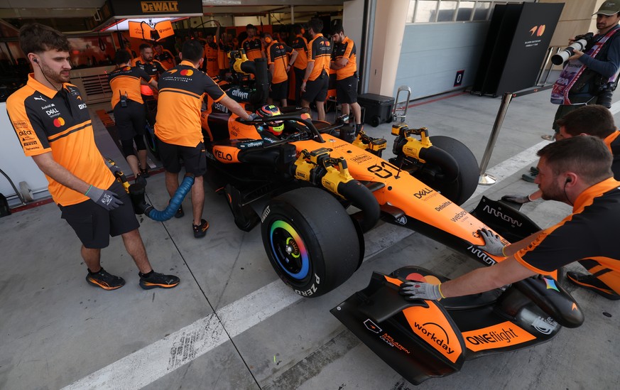 epa12733323 Mechanics push car of McLaren driver Oscar Piastri of Australia during the Formula 1 pre-season testing at Bahrain International Circuit in Sakhir, Bahrain, 13 February 2026. EPA/ALI HAIDE ...