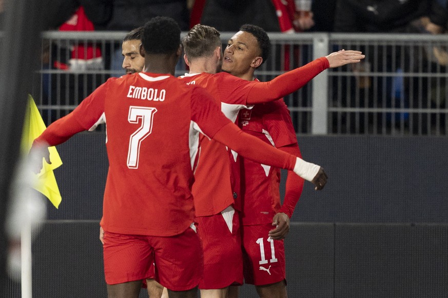 epa12855065 Switzerland's Dan Ndoye, right, celebrates his goal after scoring the first goal for Switzerland with Switzerland's Breel Embolo, left, Switzerland's Ricardo Rodriguez, cent ...