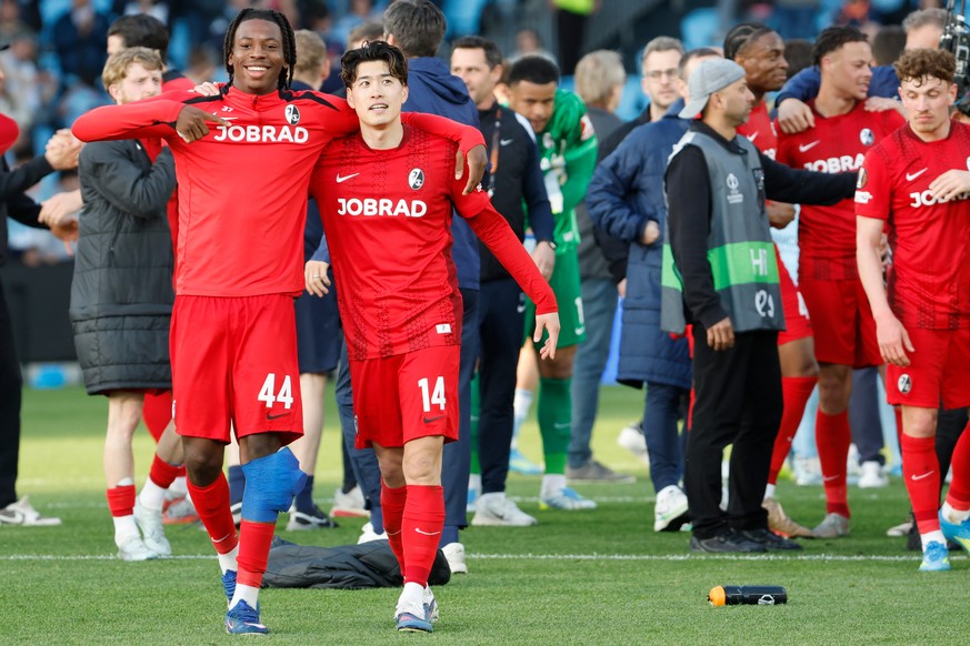 Freiburg's Johan Manzambi and his teammate Yuito Suzuki celebrate at the end of the Europa League quarterfinal second leg soccer match between Celta Vigo and Freiburg in Vigo, Spain, Thursday, Ap ...