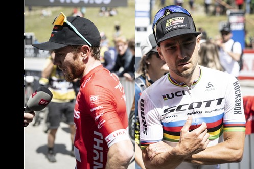 Nino Schurter et Mathias Flückiger, combat de coqs et prise de bec