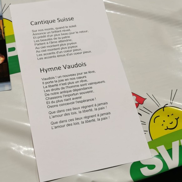 Disposées sur les tables, les paroles du cantique suisse et de l'hymne vaudois. D'ailleurs, c'est avec la Marseillaise helvétique (oui, je fais exprès) chantée par toute la salle, qu'on lance les festivités. A l'accordéon, évidemment. Pour le moment, c'est à la hauteur de mes clichés.
