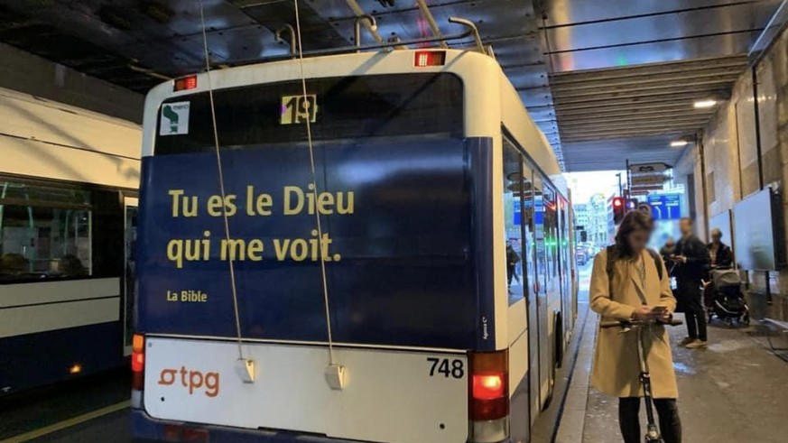 Les Transports publics genevois (TPG) ont-ils enfreint la loi cantonale sur la laïcité? Photographié vendredi dernier dans le quartier de la gare, l’arrière d’un bus de la ligne 19 arborait en grand une affiche portant l’inscription religieuse suivante: «Tu es le Dieu qui me voit». Tirée de la Genèse, premier livre de l’Ancien Testament, cette citation, accompagnée de la mention «La Bible», occupait un espace habituellement dévolu à la publicité. De fait, c’est une publicité. En l’espèce, pour la foi en Dieu et le christianisme.